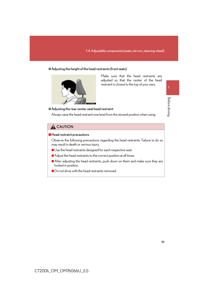 911-4. Adjustable components (s eats, mirrors, steering wheel)1Before drivingCT200h_OM_OM76066U_(U)■Adjusting the height of the head restraints (front seats)■Adjusting the rear center seat head restraintAlways raise the head restraint one level from the stowed position when using.CAUTION■Head restraint precautionsObserve the following precautions regarding the head restraints. Failure to do somay result in death or serious injury.●Use the head restraints design ed for each respective seat.●Adjust the head restraints to the correct position at all times.●After adjusting the head restraints, push down on them and make sure they arelocked in position.●Do not drive with the head restraints removed.Make sure that the head restraints areadjusted so that the center of the headrestraint is closest to the top of your ears.