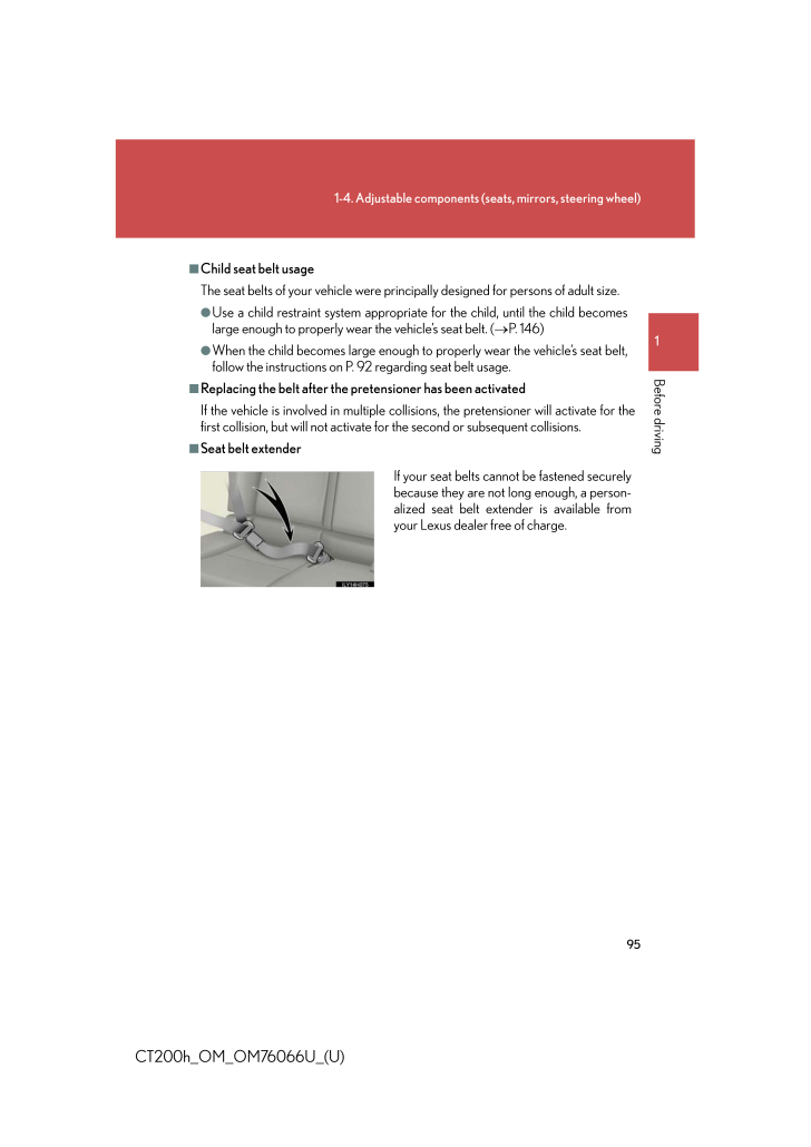 951-4. Adjustable components (s eats, mirrors, steering wheel)1Before drivingCT200h_OM_OM76066U_(U)■Child seat belt usageThe seat belts of your vehicle were princi pally designed for persons of adult size. ●Use a child restraint system appropriate for the child, until the child becomeslarge enough to properly wear the vehicle's seat belt. ( →P. 146)●When the child becomes large enough to properly wear the vehicle's seat belt,follow the instructions on P. 92 regarding seat belt usage.■Replacing the belt after the pretensioner has been activatedIf the vehicle is involved in multiple collisions, the pretensioner will activate for thefirst collision, but will not activate for the second or subsequent collisions.■Seat belt extenderIf your seat belts cannot be fastened securelybecause they are not long enough, a person-alized seat belt extender is available fromyour Lexus dealer free of charge.