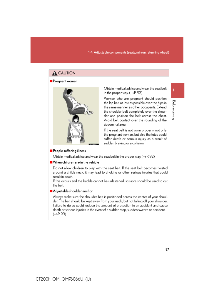 971-4. Adjustable components (s eats, mirrors, steering wheel)1Before drivingCT200h_OM_OM76066U_(U)CAUTION■Pregnant women■People suffering illnessObtain medical advice and wear the seat belt in the proper way. ( →P. 92)■When children are in the vehicleDo not allow children to play with the seat belt. If the seat belt becomes twistedaround a child's neck, it may lead to choking or other serious injuries that couldresult in death.If this occurs and the buckle cannot be un fastened, scissors should be used to cutthe belt.■Adjustable shoulder anchorAlways make sure the shoulder belt is positioned across the center of your shoul-der. The belt should be kept away from yo ur neck, but not falling off your shoulder.Failure to do so could reduce the amount of protection in an accident and causedeath or serious injuries in the event of a sudden stop, sudden swerve or accident. (→P. 93)Obtain medical advice and wear the seat beltin the proper way. (→P. 92)Women who are pregnant should positionthe lap belt as low as possible over the hips inthe same manner as other occupants. Extendthe shoulder belt completely over the shoul-der and position the belt across the chest.Avoid belt contact over the rounding of theabdominal area.If the seat belt is not worn properly, not onlythe pregnant woman, but also the fetus couldsuffer death or serious injury as a result ofsudden braking or a collision.