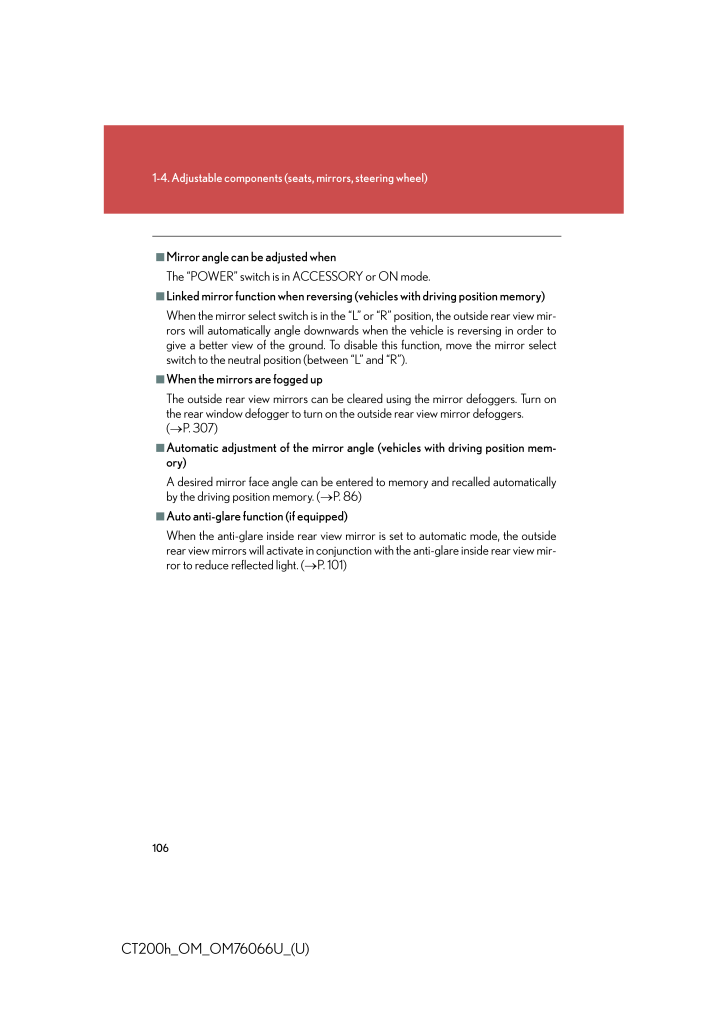 1061-4. Adjustable components (s eats, mirrors, steering wheel)CT200h_OM_OM76066U_(U)■Mirror angle can be adjusted whenThe "POWER" switch is in ACCESSORY or ON mode.■Linked mirror function when reversing (vehicles with driving position memory)When the mirror select switch is in the "L " or "R" position, the outside rear view mir-rors will automatically angle downwards when the vehicle is reversing in order togive a better view of the ground. To disable this function, move the mirror selectswitch to the neutral position (between "L" and "R").■When the mirrors are fogged upThe outside rear view mirrors can be cleared using the mirror defoggers. Turn onthe rear window defogger to turn on the outside rear view mirror defoggers. (→P. 307)■Automatic adjustment of the mirror angle (vehicles with driving position mem-ory)A desired mirror face angle can be entered to memory and recalled automaticallyby the driving position memory. ( →P. 86)■Auto anti-glare function (if equipped)When the anti-glare inside rear view mirr or is set to automatic mode, the outsiderear view mirrors will activate in conjunction with the anti-glare inside rear view mir-ror to reduce reflected light. ( →P. 101)
