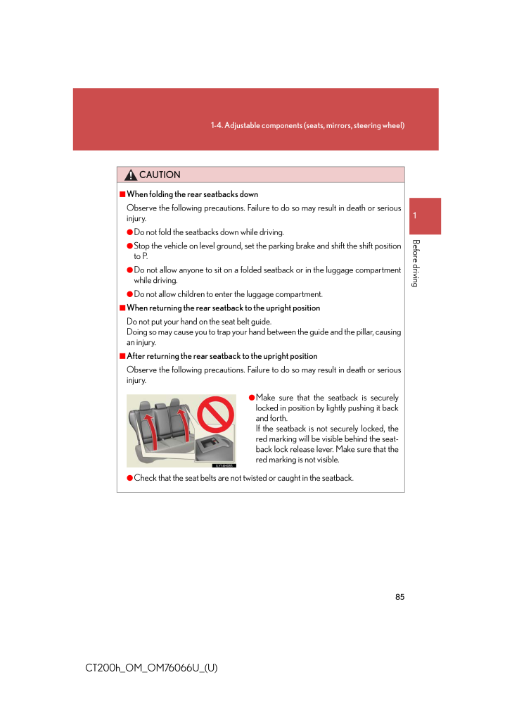 851-4. Adjustable components (s eats, mirrors, steering wheel)1Before drivingCT200h_OM_OM76066U_(U)CAUTION■When folding the rear seatbacks downObserve the following precautions. Failure to do so may result in death or seriousinjury.●Do not fold the seatbacks down while driving.●Stop the vehicle on level ground, set the parking brake and shift the shift positionto P.●Do not allow anyone to sit on a folded seatback or in the luggage compartmentwhile driving.●Do not allow children to enter the luggage compartment.■When returning the rear seatback to the upright positionDo not put your hand on the seat belt guide. Doing so may cause you to trap your hand between the guide and the pillar, causingan injury.■After returning the rear seatback to the upright positionObserve the following precautions. Failure to do so may result in death or seriousinjury.●Check that the seat belts are not tw isted or caught in the seatback.●Make sure that the seatback is securelylocked in position by lightly pushing it backand forth.If the seatback is not securely locked, thered marking will be visible behind the seat-back lock release lever. Make sure that thered marking is not visible.