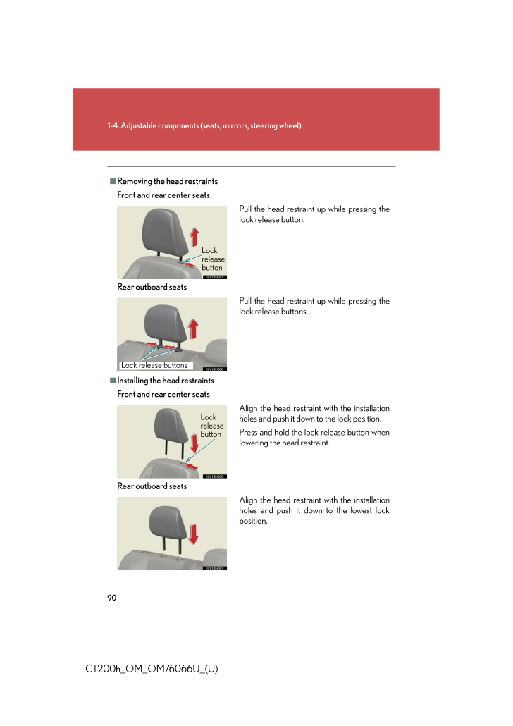 901-4. Adjustable components (s eats, mirrors, steering wheel)CT200h_OM_OM76066U_(U)■Removing the head restraintsFront and rear center seatsRear outboard seats■Installing the head restraintsFront and rear center seatsRear outboard seatsPull the head restraint up while pressing thelock release button.LockreleasebuttonPull the head restraint up while pressing thelock release buttons.Lock release buttonsAlign the head restraint with the installationholes and push it down to the lock position.Press and hold the lock release button whenlowering the head restraint.LockreleasebuttonAlign the head restraint with the installationholes and push it down to the lowest lockposition.