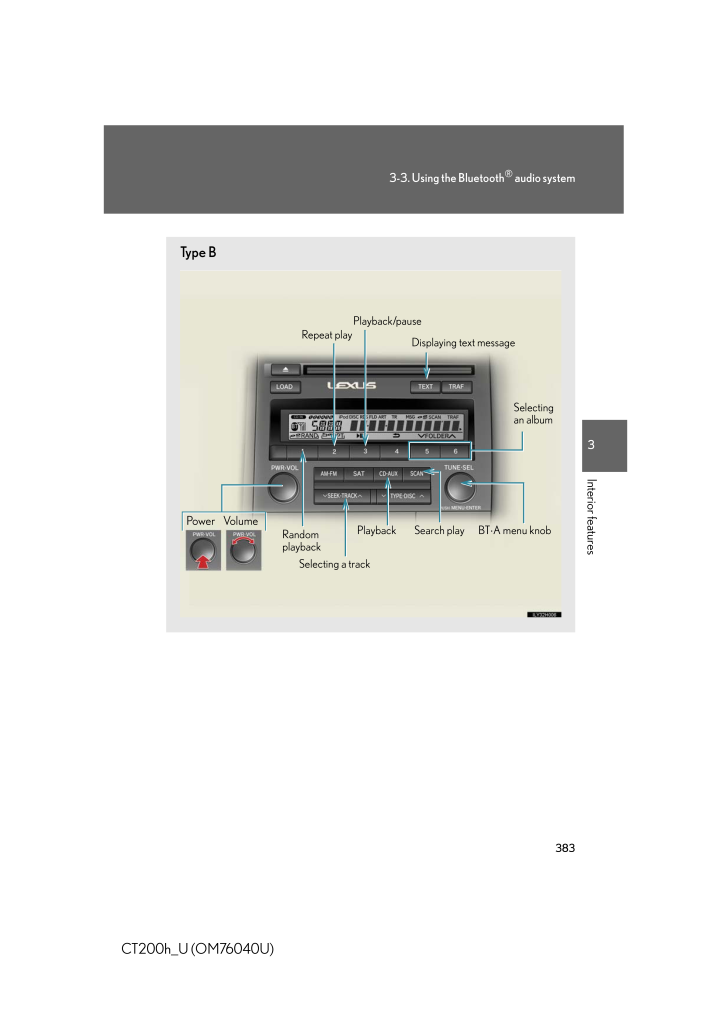 3833-3. Using the Bluetooth(R) audio system3Interior featuresCT200h_U (OM76040U)Type BDisplaying text messageSelecting a trackPower VolumeRepeat playPlayback/pauseSearch playPlaybackSelecting an albumBT⋅A menu knobRandom playback