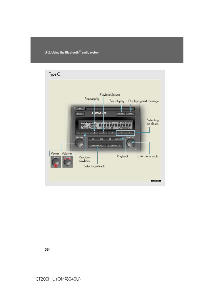 3843-3. Using the Bluetooth(R) audio systemCT200h_U (OM76040U)Type CDisplaying text messageSelecting a trackPower VolumeRepeat playPlayback/pauseSearch playSelecting an albumPlayback BT⋅A menu knobRandom playback