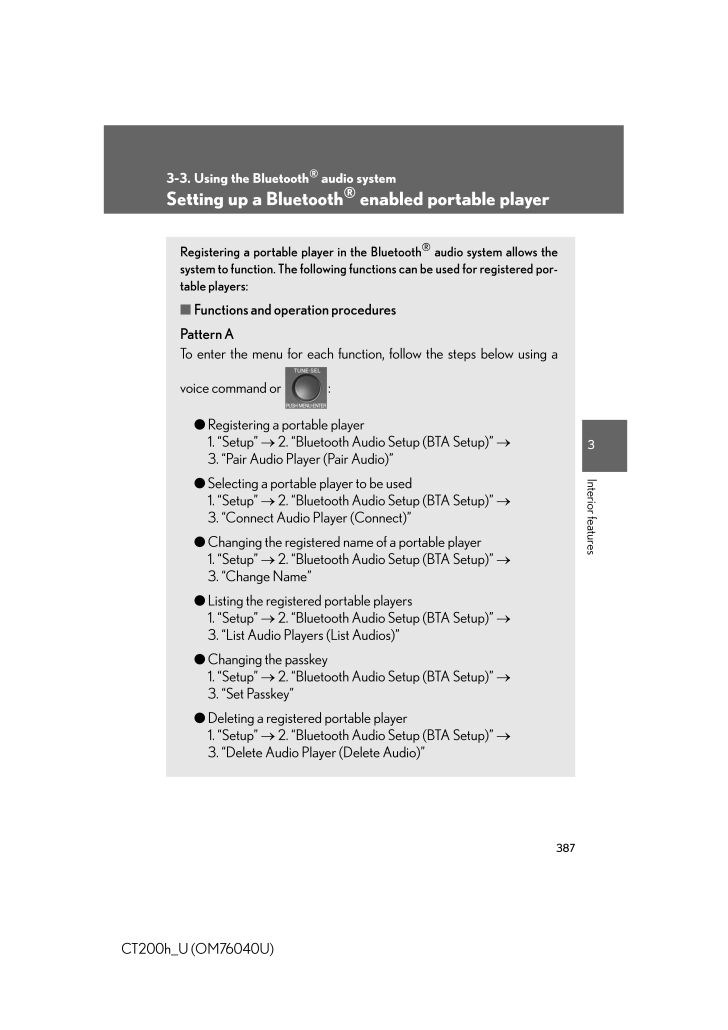 3873-3. Using the Bluetooth(R) audio system3Interior featuresCT200h_U (OM76040U)Setting up a Bluetooth(R) enabled portable playerRegistering a portable player in the Bluetooth(R) audio system allows thesystem to function. The following functions can be used for registered por-table players:■Functions and operation proceduresPattern ATo enter the menu for each function , follow the steps below using avoice command or :●Registering a portable player 1. "Setup" → 2. "Bluetooth Audio Setup (BTA Setup)" → 3. "Pair Audio Player (Pair Audio)"●Selecting a portable player to be used 1. "Setup" → 2. "Bluetooth Audio Setup (BTA Setup)" → 3. "Connect Audio Player (Connect)"●Changing the registered name of a portable player 1. "Setup" → 2. "Bluetooth Audio Setup (BTA Setup)" → 3. "Change Name"●Listing the registered portable players 1. "Setup" → 2. "Bluetooth Audio Setup (BTA Setup)" → 3. "List Audio Players (List Audios)"●Changing the passkey 1. "Setup" → 2. "Bluetooth Audio Setup (BTA Setup)" → 3. "Set Passkey"●Deleting a registered portable player 1. "Setup" → 2. "Bluetooth Audio Setup (BTA Setup)" → 3. "Delete Audio Player (Delete Audio)"