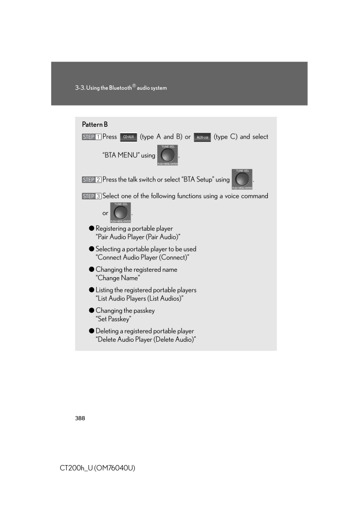 3883-3. Using the Bluetooth(R) audio systemCT200h_U (OM76040U)Pattern BPress (type A and B) or (type C) and select"BTA MENU" using .Press the talk switch or select "BTA Setup" using .Select one of the following functions using a voice commandor .●Registering a portable player "Pair Audio Player (Pair Audio)"●Selecting a portable player to be used "Connect Audio Player (Connect)"●Changing the registered name "Change Name"●Listing the registered portable players "List Audio Players (List Audios)"●Changing the passkey "Set Passkey"●Deleting a registered portable player "Delete Audio Player (Delete Audio)"STEP 1STEP 2STEP 3