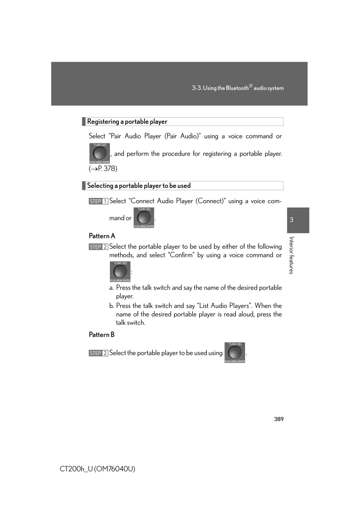 3893-3. Using the Bluetooth(R) audio system3Interior featuresCT200h_U (OM76040U)Registering a portable playerSelect "Pair Audio Player (Pair Audio)" using a voice command or, and perform the procedure for registering a portable player.(→P. 378)Selecting a portable player to be usedSelect "Connect Audio Player (Connect)" using a voice com-mand or .Pattern ASelect the portable player to be used by either of the followingmethods, and select "Confirm" by using a voice command or:a. Press the talk switch and say the name of the desired portableplayer.b. Press the talk switch and say "List Audio Players". When thename of the desired portable pl ayer is read aloud, press thetalk switch.Pattern BSelect the portable player to be used using .STEP 1STEP 2STEP 2