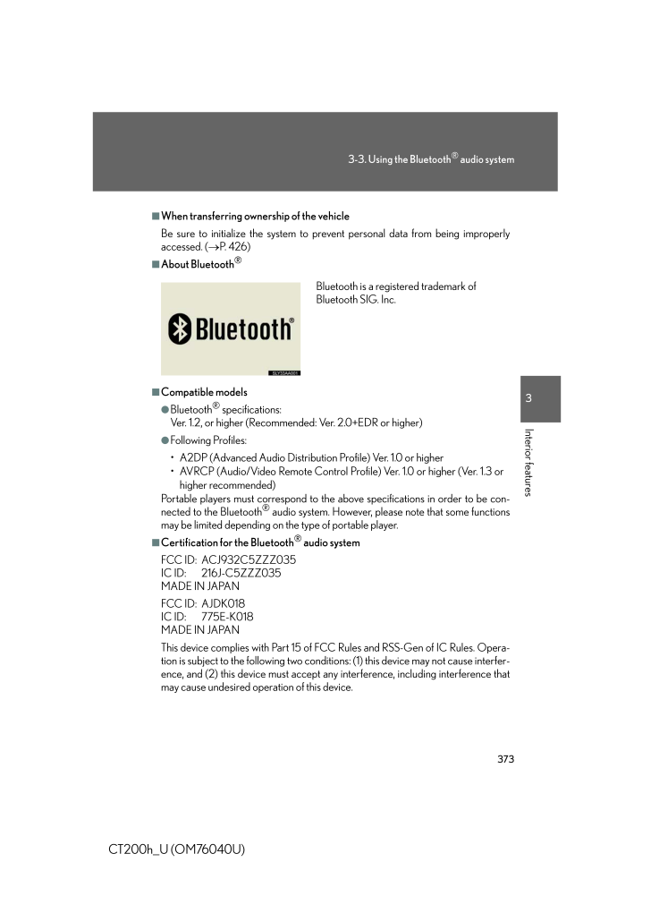 3733-3. Using the Bluetooth(R) audio system3Interior featuresCT200h_U (OM76040U)■When transferring ownership of the vehicleBe sure to initialize the system to prevent personal data from being improperlyaccessed. (→P. 426)■About Bluetooth(R)■Compatible models●Bluetooth(R) specifications:Ver. 1.2, or higher (Recommended: Ver. 2.0+EDR or higher)●Following Profiles:* A2DP (Advanced Audio Distribution Profile) Ver. 1.0 or higher* AVRCP (Audio/Video Remote Control Profile) Ver. 1.0 or higher (Ver. 1.3 orhigher recommended)Portable players must correspond to the above specifications in order to be con-nected to the Bluetooth(R) audio system. However, please note that some functionsmay be limited depending on the type of portable player.■Certification for the Bluetooth(R) audio systemFCC ID: ACJ932C5ZZZ035IC ID: 216J-C5ZZZ035 MADE IN JAPANFCC ID: AJDK018IC ID: 775E-K018MADE IN JAPANThis device complies with Part 15 of FCC Rules and RSS-Gen of IC Rules. Opera-tion is subject to the following two conditio ns: (1) this device may not cause interfer-ence, and (2) this device must accept an y interference, including interference thatmay cause undesired operation of this device. Bluetooth is a registered trademark of Bluetooth SIG. Inc.