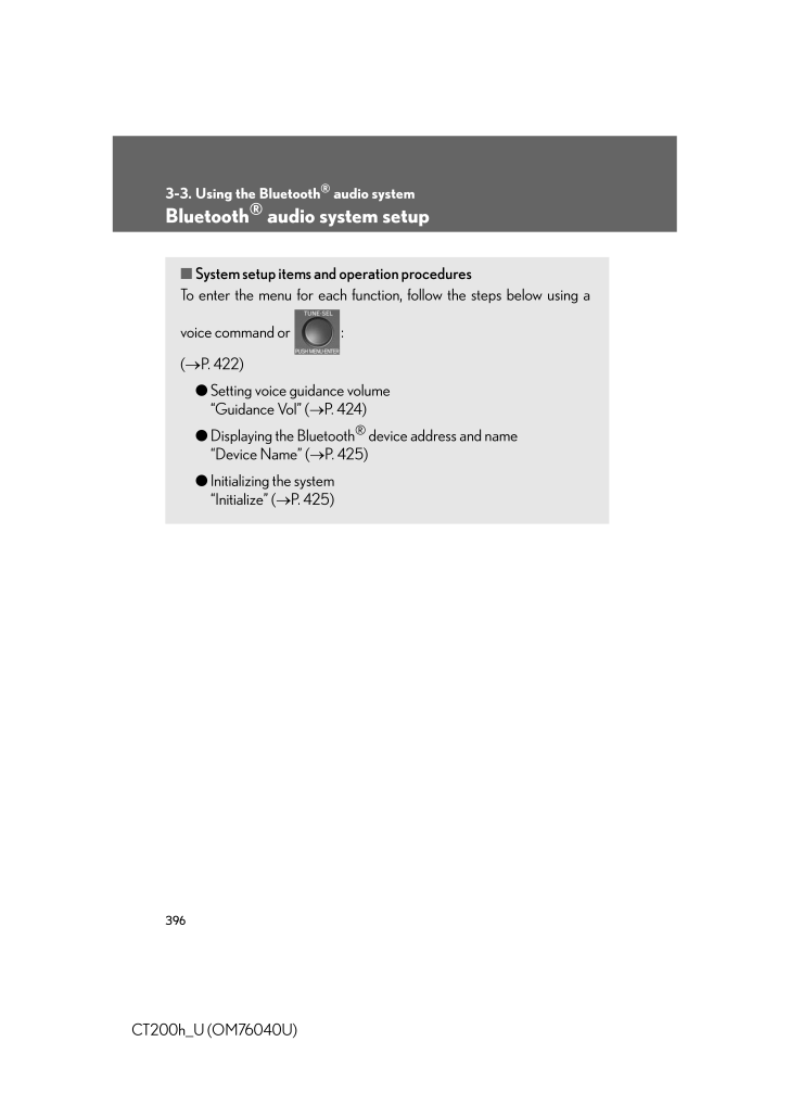 3963-3. Using the Bluetooth(R) audio systemCT200h_U (OM76040U)Bluetooth(R) audio system setup■System setup items and operation proceduresTo enter the menu for each function , follow the steps below using avoice command or : (→P. 422)●Setting voice guidance volume "Guidance Vol" (→P. 424)●Displaying the Bluetooth(R) device address and name"Device Name" (→P. 425)●Initializing the system "Initialize" (→P. 425)
