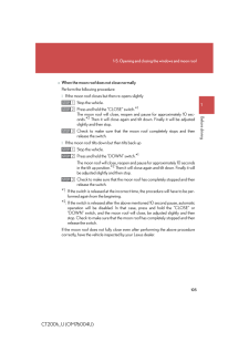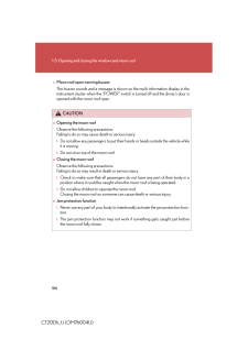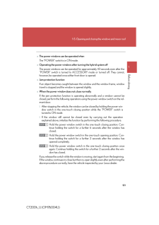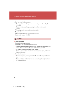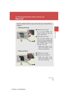 100CT200h_U (OM76004U)1-5. Opening and closing th e windows and moon roofPower windowsWindow lock switchPress the switch down to lock the passenger window.Use this switch to prevent children from accidentally opening or clos-ing a passenger window.The power windows can be opened and closed using the switches.Operating the switch moves the windows as follows:ClosingOne-touch closing*OpeningOne-touch opening**: Pushing the switch in the opposite direction will stop window travel partway.