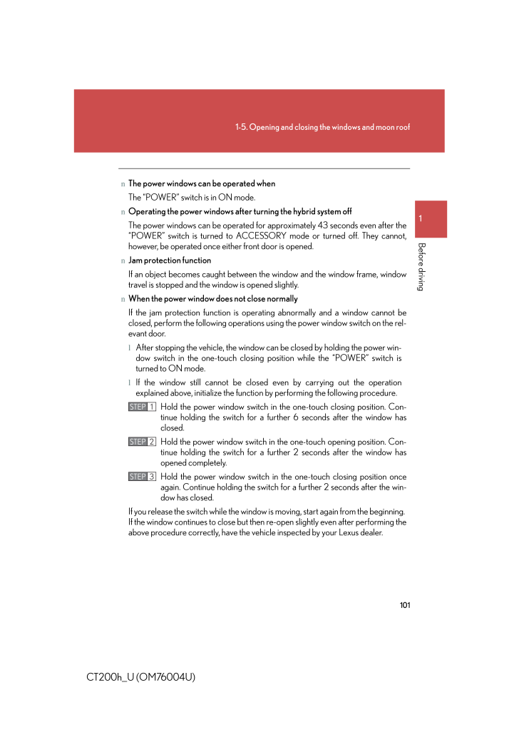 1011-5. Opening and closing the windows and moon roof1Before drivingCT200h_U (OM76004U)nThe power windows can be operated whenThe "POWER" switch is in ON mode.nOperating the power windows after turning the hybrid system offThe power windows can be operated for approximately 43 seconds even after the "POWER" switch is turned to ACCESSORY mode or turned off. They cannot, however, be operated once either front door is opened. nJam protection functionIf an object becomes caught between th e window and the window frame, window travel is stopped and the window is opened slightly. nWhen the power window does not close normallyIf the jam protection function is operat ing abnormally and a window cannot be closed, perform the following operations using the power window switch on the rel-evant door.lAfter stopping the vehicle, the window can be closed by holding the power win-dow switch in the one-touch closing po sition while the "POWER" switch is turned to ON mode.lIf the window still cannot be closed even by carrying out the operation explained above, initialize the function by performing the following procedure. Hold the power window switch in the one-touch closing position. Con-tinue holding the switch for a further 6 seconds after the window has closed.Hold the power window switch in the one-touch opening position. Con-tinue holding the switch for a further 2 seconds after the window has opened completely.Hold the power window switch in th e one-touch closing position once again. Continue holding the switch for a further 2 seconds after the win-dow has closed.If you release the switch while the window is moving, start again from the beginning. If the window continues to close but then re-open slightly even after performing the above procedure correctly, have the vehicle inspected by your Lexus dealer. STEP 1STEP 2STEP 3