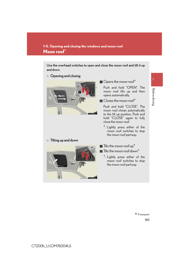 10311-5. Opening and closing the windows and moon roofBefore drivingCT200h_U (OM76004U)Moon roof∗∗: If equippedUse the overhead switches to open and close the moon roof and tilt it up and down.nOpening and closingOpens the moon roof*Push and hold "OPEN". The moon roof tilts up and then opens automatically.Closes the moon roof *Push and hold "CLOSE". The moon roof closes automatically to the tilt up position. Push and hold "CLOSE" again to fully close the moon roof.*: Lightly press either of the moon roof switches to stop the moon roof partway.nTilting up and downTilts the moon roof up*Tilts the moon roof down **: Lightly press either of the moon roof switches to stop the moon roof partway.