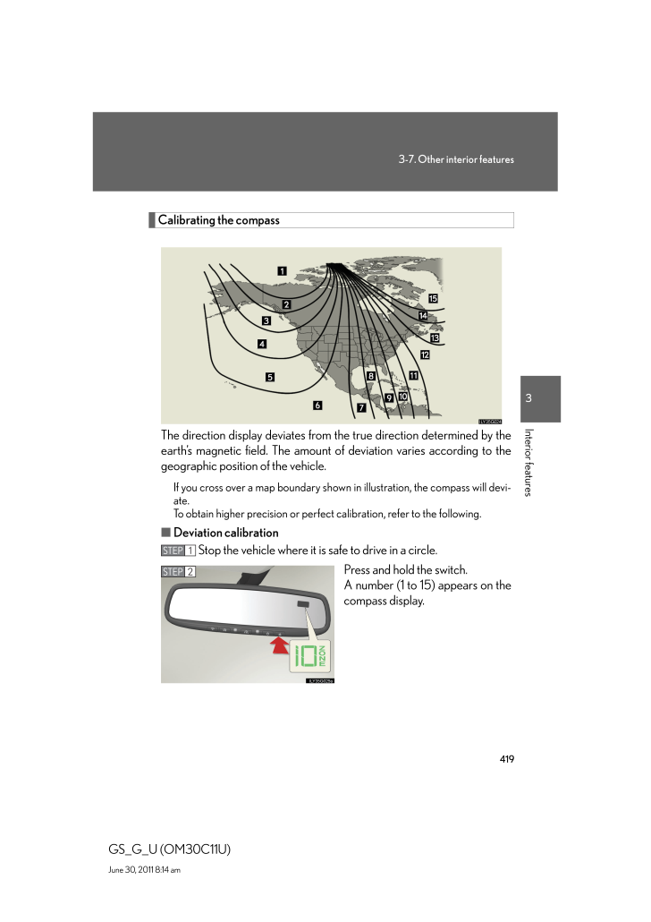 4193-7. Other interior features3Interior featuresGS_G_U (OM30C11U)June 30, 2011 8:14 amCalibrating the compassThe direction display deviates from the true direction determined by theearth's magnetic field. The amount of deviation varies according to thegeographic position of the vehicle.If you cross over a map boundary shown in illustration, the compass will devi-ate.To obtain higher precision or perfect calibration, refer to the following.■ Deviation calibrationStop the vehicle where it is safe to drive in a circle.Press and hold the switch.A number (1 to 15) appears on thecompass display.STEP 1STEP 2