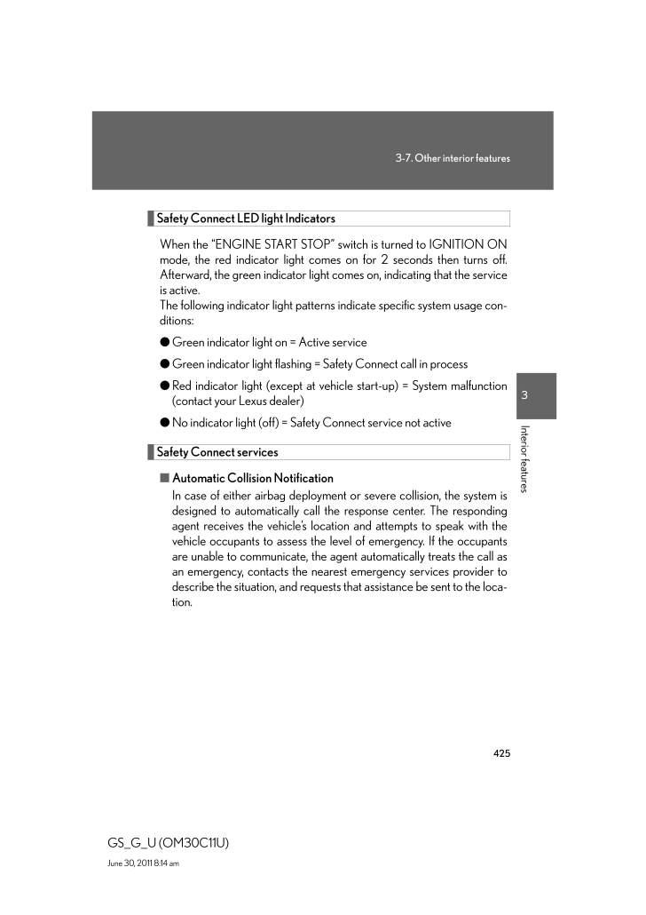 4253-7. Other interior features3Interior featuresGS_G_U (OM30C11U)June 30, 2011 8:14 amSafety Connect LED light IndicatorsWhen the "ENGINE START STOP" swit ch is turned to IGNITION ONmode, the red indicator light comes on for 2 seconds then turns off.Afterward, the green indicator light comes on, indicating that the serviceis active.The following indicator light patterns indicate specific system usage con-ditions:● Green indicator light on = Active service● Green indicator light flashing = Safety Connect call in process● Red indicator light (except at vehicle start-up) = System malfunction(contact your Lexus dealer)● No indicator light (off) = Safety Connect service not activeSafety Connect services■ Automatic Collision NotificationIn case of either airbag deployment or severe collision, the system isdesigned to automatically call the response center. The respondingagent receives the vehicle's locati on and attempts to speak with thevehicle occupants to assess the leve l of emergency. If the occupantsare unable to communicate, the agent automatically treats the call asan emergency, contacts the nearest emergency services provider todescribe the situation, and requests that assistance be sent to the loca-tion.