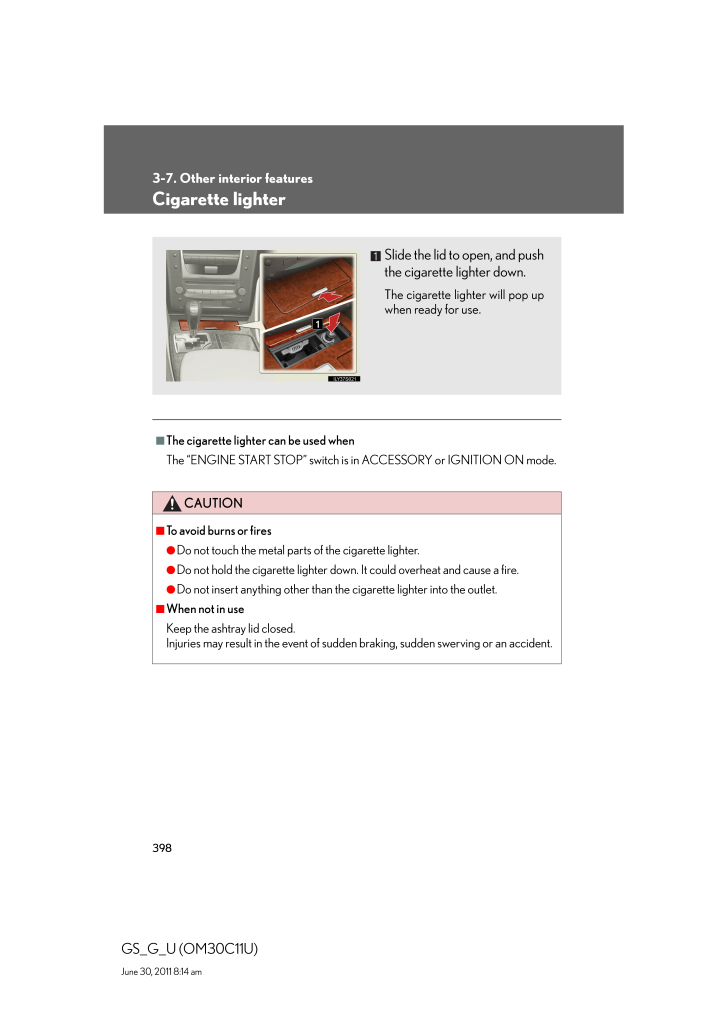 3983-7. Other interior featuresGS_G_U (OM30C11U)June 30, 2011 8:14 amCigarette lighter■The cigarette lighter can be used whenThe "ENGINE START STOP" switch is in ACCESSORY or IGNITION ON mode.CAUTION■To avoid burns or fires●Do not touch the metal parts of the cigarette lighter.●Do not hold the cigarette lighter down. It could overheat and cause a fire.●Do not insert anything other than the cigarette lighter into the outlet.■When not in useKeep the ashtray lid closed.Injuries may result in the event of sudden braking, sudden swerving or an accident.Slide the lid to open, and pushthe cigarette lighter down.The cigarette lighter will pop upwhen ready for use.