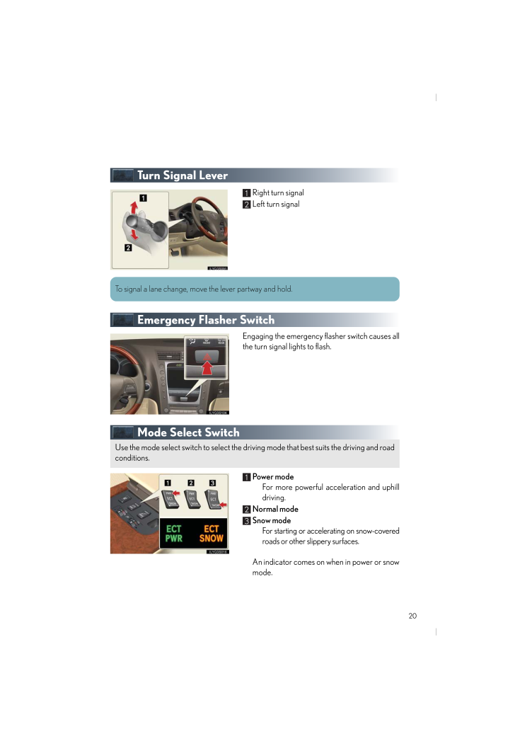 Quick_GS_G_U20Turn Signal LeverRight turn signalLeft turn signalEmergency Flasher SwitchEngaging the emergency flasher switch causes allthe turn signal lights to flash.Mode Select SwitchPower modeFor more powerful acceleration and uphilldriving.Normal modeSnow modeFor starting or accelerating on snow-coveredroads or other slippery surfaces.An indicator comes on when in power or snowmode.12To signal a lane change, move the lever partway and hold.Use the mode select switch to select the driving mode that best suits the driving and roadconditions.123Quick_GS_G_U.book Page 20 Tues day, August 18, 2009 10:24 AM