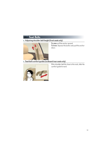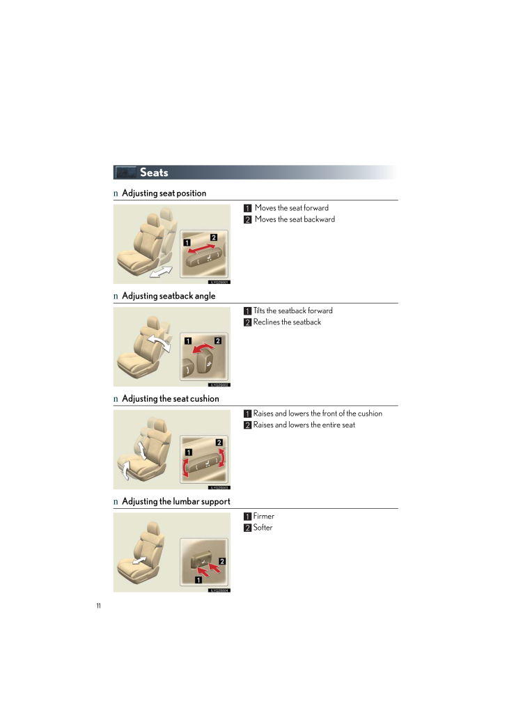 11Quick_GS_G_USeatsnAdjusting seat position Moves the seat forward Moves the seat backwardnAdjusting seatback angleTilts the seatback forwardReclines the seatbacknAdjusting the seat cushionRaises and lowers the front of the cushionRaises and lowers the entire seatnAdjusting the lumbar supportFirmerSofter12121212Quick_GS_G_U.book Page 11 Tues day, August 18, 2009 10:24 AM