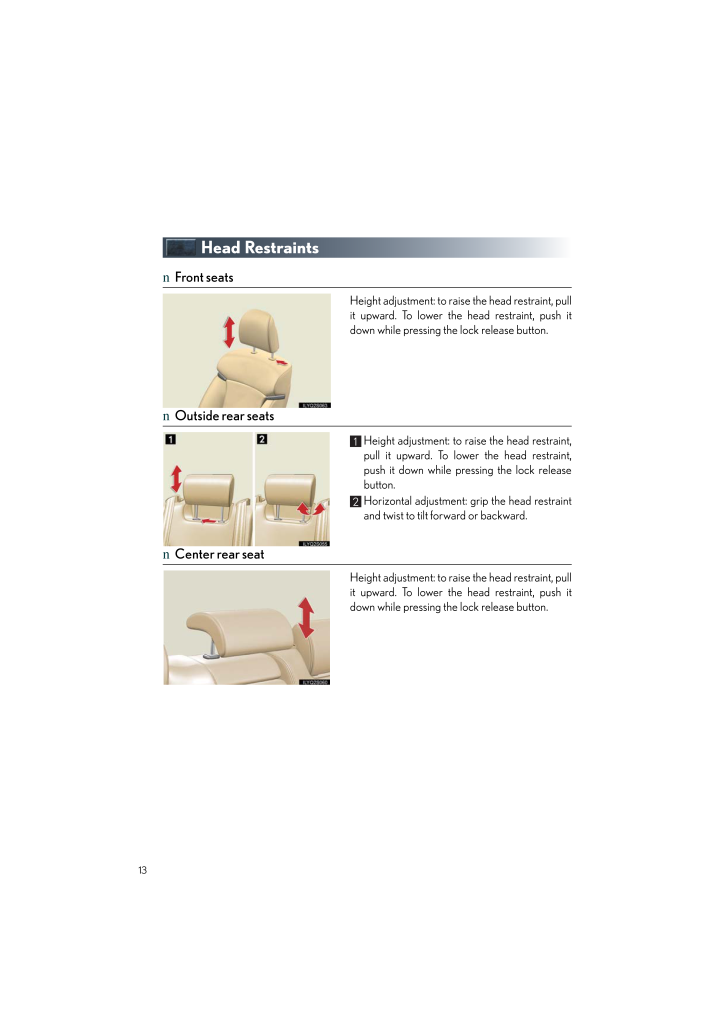 13Quick_GS_G_UHead RestraintsnFront seatsHeight adjustment: to raise the head restraint, pullit upward. To lower the head restraint, push itdown while pressing the lock release button.nOutside rear seatsHeight adjustment: to raise the head restraint,pull it upward. To lower the head restraint,push it down while pressing the lock releasebutton.Horizontal adjustment: grip the head restraintand twist to tilt forward or backward.nCenter rear seatHeight adjustment: to raise the head restraint, pullit upward. To lower the head restraint, push itdown while pressing the lock release button.12Quick_GS_G_U.book Page 13 Tues day, August 18, 2009 10:24 AM