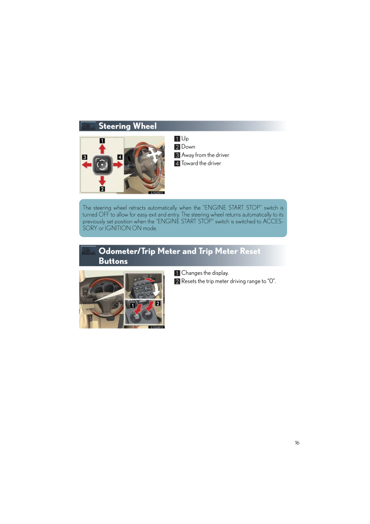 Quick_GS_G_U16Steering WheelUpDownAway from the driverToward the driverOdometer/Trip Meter and Trip Meter Reset ButtonsChanges the display.Resets the trip meter driving range to "0".1234The steering wheel retracts automatically when the "ENGINE START STOP" switch isturned OFF to allow for easy exit and entry. The steering wheel returns automatically to itspreviously set position when the "ENGINE START STOP" switch is switched to ACCES-SORY or IGNITION ON mode.12Quick_GS_G_U.book Page 16 Tues day, August 18, 2009 10:24 AM