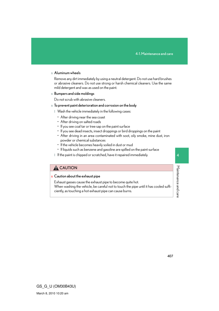 4074-1. Maintenance and care4Maintenance and careGS_G_U (OM30B43U)March 8, 2010 10:20 amnAluminum wheelsRemove any dirt immediately by using a neutral detergent. Do not use hard brushes or abrasive cleaners. Do not use strong or harsh chemical cleaners. Use the same mild detergent and wax as used on the paint.nBumpers and side moldingsDo not scrub with abrasive cleaners.nTo prevent paint deterioration and corrosion on the bodylWash the vehicle immediately in the following cases:* After driving near the sea coast* After driving on salted roads* If you see coal tar or tree sap on the paint surface* If you see dead insects, insect droppings or bird droppings on the paint* After driving in an area contaminated with soot, oily smoke, mine dust, iron powder or chemical substances* If the vehicle becomes heavily soiled in dust or mud* If liquids such as benzene and gasoline are spilled on the paint surfacelIf the paint is chipped or scratched, have it repaired immediately.CAUTIONnCaution about the exhaust pipeExhaust gasses cause the exhaus t pipe to become quite hot. When washing the vehicle, be careful not to touch the pipe until it has cooled suffi-ciently, as touching a hot exhaust pipe can cause burns.