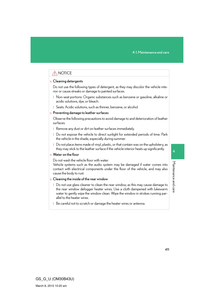 4114-1. Maintenance and care4Maintenance and careGS_G_U (OM30B43U)March 8, 2010 10:20 amNOTICEnCleaning detergentsDo not use the following types of detergent, as they may discolor the vehicle inte-rior or cause streaks or damage to painted surfaces.lNon-seat portions: Organic substances such as benzene or gasoline, alkaline or acidic solutions, dye, or bleach.lSeats: Acidic solutions, such as thinner, benzene, or alcohol.nPreventing damage to leather surfacesObserve the following precautions to avoid damage to and deterioration of leather surfaces.lRemove any dust or dirt on leather surfaces immediately.lDo not expose the vehicle to direct sunl ight for extended periods of time. Park the vehicle in the shade, especially during summer.lDo not place items made of vinyl, plastic, or that contain wax on the upholstery, as they may stick to the leather surface if the vehicle interior heats up significantly.nWater on the floorDo not wash the vehicle floor with water. Vehicle systems such as the audio system may be damaged if water comes into contact with electrical components under the floor of the vehicle, and may also cause the body to rust.nCleaning the inside of the rear windowlDo not use glass cleaner to clean the rear window, as this may cause damage to the rear window defogger heater wires. Use a cloth dampened with lukewarm water to gently wipe the window clean. Wipe the window in strokes running par-allel to the heater wires.lBe careful not to scratch or damage the heater wires or antenna.