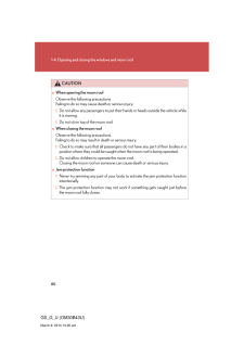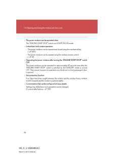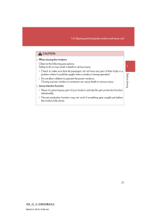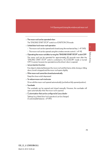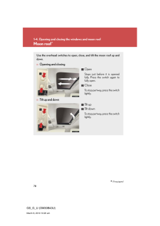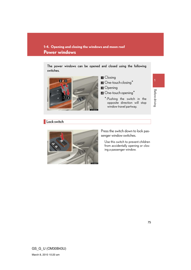751Before drivingGS_G_U (OM30B43U)March 8, 2010 10:20 am1-4. Opening and closing th e windows and moon roofPower windowsLock switchPress the switch down to lock pas-senger window switches.Use this switch to prevent children from accidentally opening or clos-ing a passenger window.The power windows can be opened and closed using the following switches. ClosingOne-touch closing*OpeningOne-touch opening**:Pushing the switch in the opposite direction will stop window travel partway.
