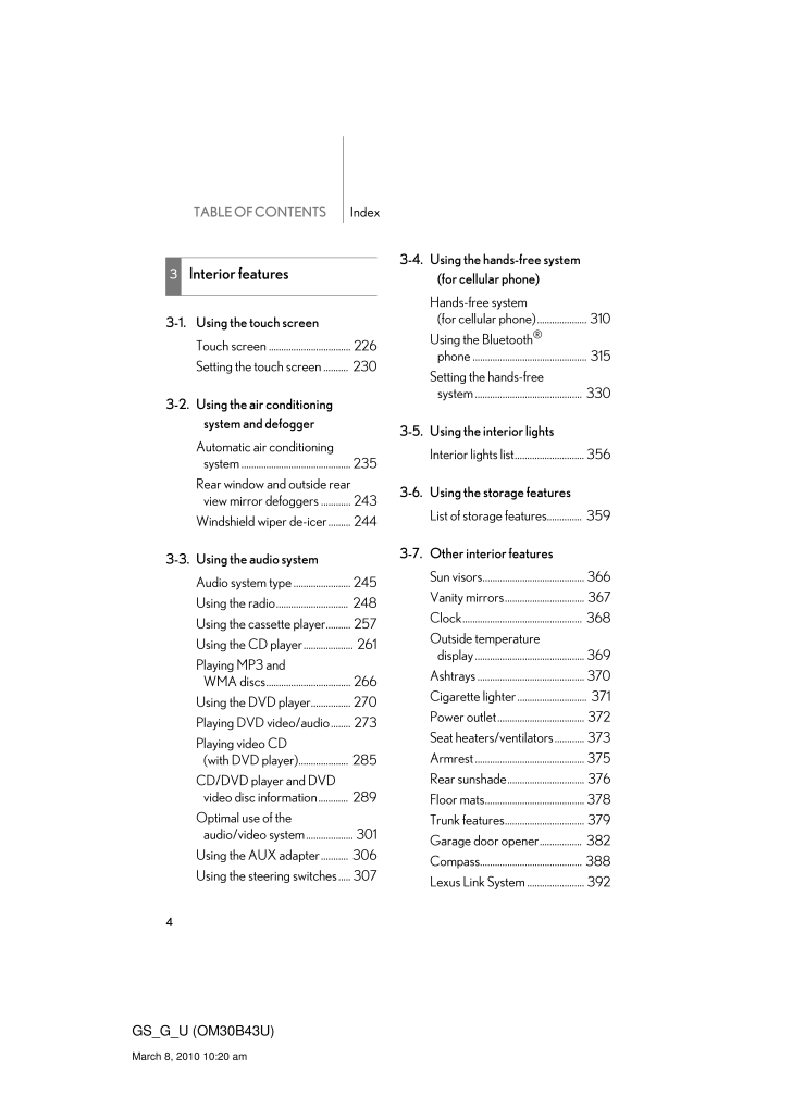 TABLE OF CONTENTS Index4GS_G_U (OM30B43U)March 8, 2010 10:20 am3-1. Using the touch screenTouch screen................................. 226Setting the touch screen.......... 2303-2. Using the air conditioning system and defoggerAutomatic air conditioning system............................................ 235Rear window and outside rear view mirror defoggers............ 243Windshield wiper de-icer......... 2443-3. Using the audio systemAudio system type....................... 245Using the radio............................. 248Using the cassette player.......... 257Using the CD player.................... 261Playing MP3 and WMA discs.................................. 266Using the DVD player................ 270Playing DVD video/audio........ 273Playing video CD (with DVD player).................... 285CD/DVD player and DVD video disc information............ 289Optimal use of the audio/video system................... 301Using the AUX ad apter........... 306Using the steering switches..... 3073-4. Using the hands-free system (for cellular phone)Hands-free system (for cellular phone).................... 310Using the Bluetooth(R) phone.............................................. 315Setting the hands-free system........................................... 3303-5. Using the interior lightsInterior lights list............................ 3563-6. Using the storage featuresList of storage features.............. 3593-7. Other interior featuresSun visors......................................... 366Vanity mirrors................................ 367Clock................................................ 368Outside temperature display............................................ 369Ashtrays........................................... 370Cigarette lighter............................ 371Power outlet................................... 372Seat heaters/ventilators............ 373Armrest............................................ 375Rear sunshade............................... 376Floor mats........................................ 378Trunk features................................ 379Garage door opener................. 382Compass......................................... 388Lexus Link System....................... 3923Interior features