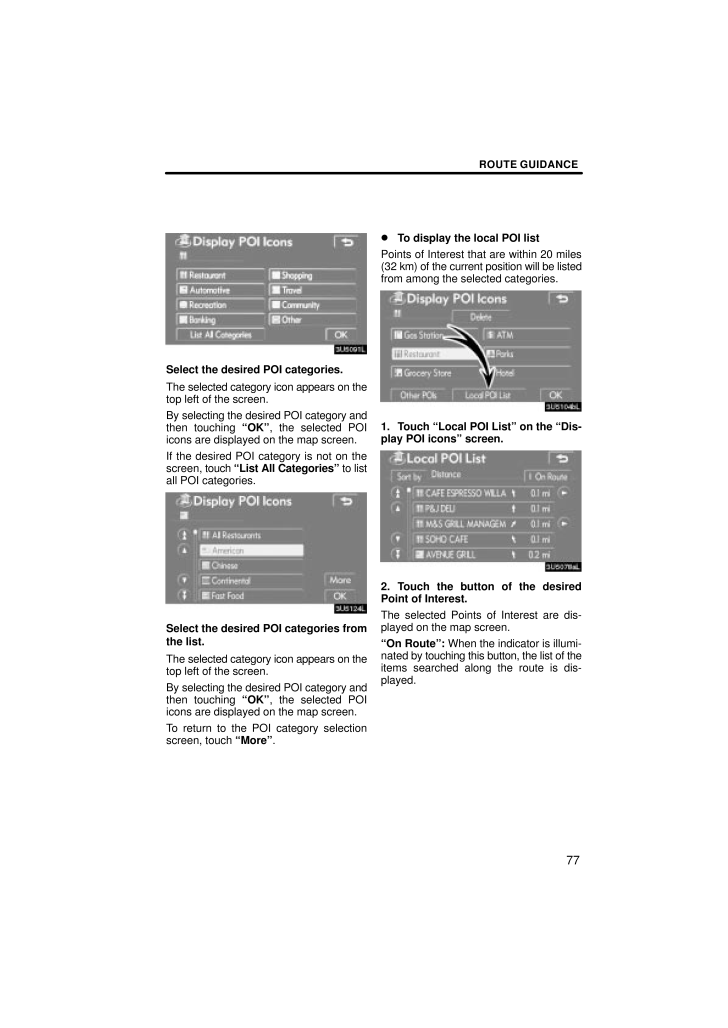 ROUTE GUIDANCE77Select the desired POI categories.The selected category icon appears on thetop left of the screen.By selecting the desired POI category andthen touching "OK", the selected POIicons are displayed on the map screen.If the desired POI category is not on thescreen, touch "List All Categories" to listall POI categories.Select the desired POI categories fromthe list.The selected category icon appears on thetop left of the screen.By selecting the desired POI category andthen touching "OK", the selected POIicons are displayed on the map screen.To return to the POI category selectionscreen, touch "More". To display the local POI listPoints of Interest that are within 20 miles(32 km) of the current position will be listedfrom among the selected categories.1. Touch "Local POI List" on the "Dis-play POI icons" screen.2. Touch the button of the desiredPoint of Interest.The selected Points of Interest are dis-played on the map screen."On Route": When the indicator is illumi-nated by touching this button, the list of theitems searched along the route is dis-played.