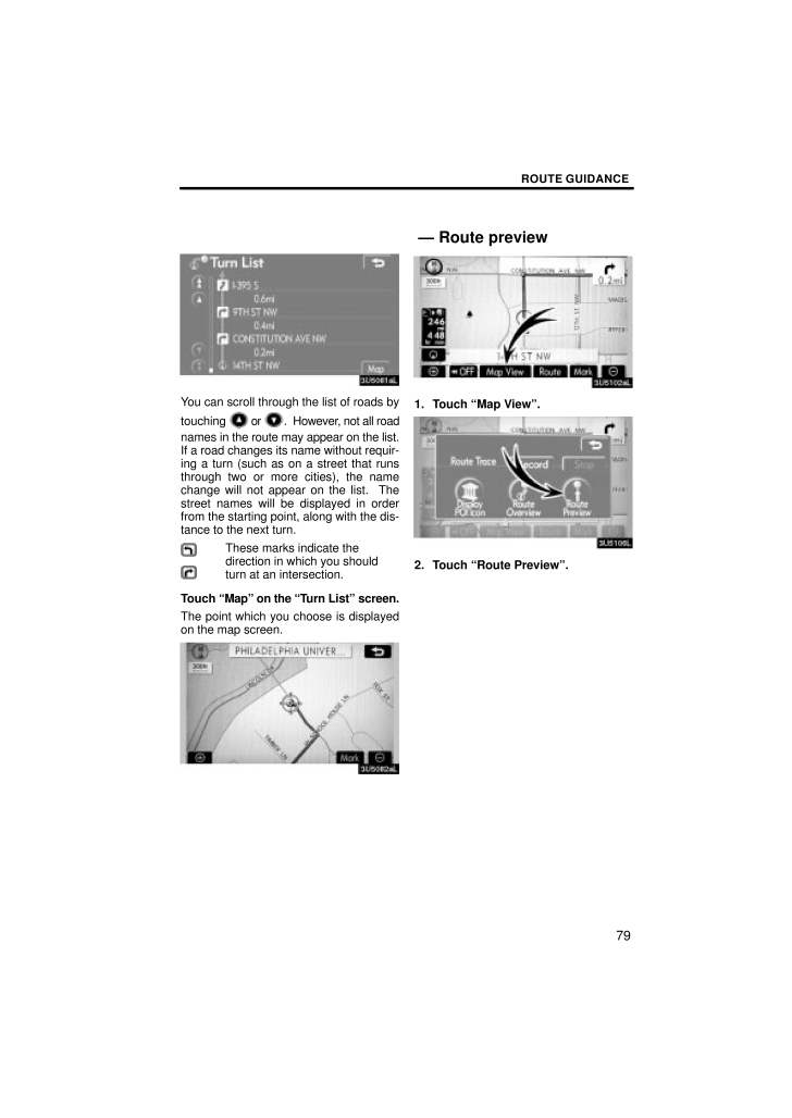 ROUTE GUIDANCE79You can scroll through the list of roads bytouching or . However, not all roadnames in the route may appear on the list.If a road changes its name without requir-ing a turn (such as on a street that runsthrough two or more cities), the namechange will not appear on the list. Thestreet names will be displayed in orderfrom the starting point, along with the dis-tance to the next turn.These marks indicate thedirection in which you shouldturn at an intersection.Touch "Map" on the "Turn List" screen.The point which you choose is displayedon the map screen.1. Touch "Map View".2. Touch "Route Preview".- Route preview