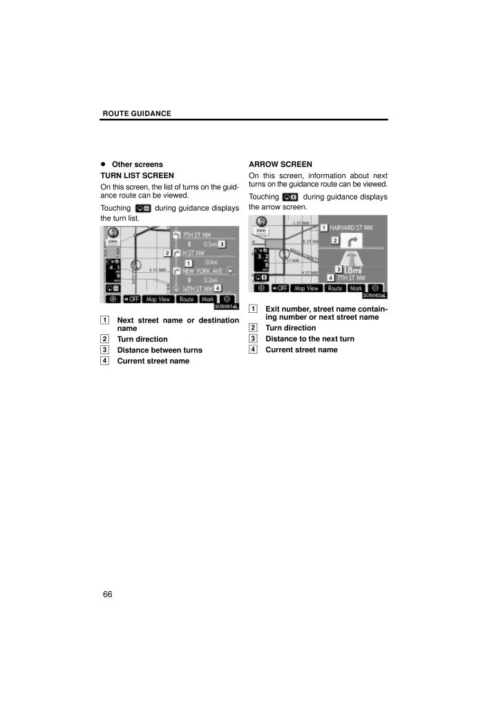 ROUTE GUIDANCE66Other screensTURN LIST SCREENOn this screen, the list of turns on the guid-ance route can be viewed.Touching during guidance displaysthe turn list.1Next street name or destinationname2Turn direction3Distance between turns4Current street nameARROW SCREENOn this screen, information about nextturns on the guidance route can be viewed.Touching during guidance displaysthe arrow screen.1Exit number, street name contain-ing number or next street name2Turn direction3Distance to the next turn4Current street name