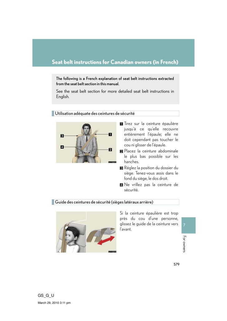 5797GS_G_UMarch 29, 2010 3:11 pmFor ownersSeat belt instructions for Canadian owners (in French)The following is a French explanation of seat belt instructions extracted from the seat belt section in this manual.See the seat belt section for more detailed seat belt instructions in English.Utilisation adequate des ceintures de securiteTirez sur la ceinture epaulierejusqu'a ce qu'elle recouvreentierement l'epaule; elle nedoit cependant pas toucher lecou ni glisser de l'epaule.Placez la ceinture abdominalele plus bas possible sur leshanches.Reglez la position du dossier dusiege. Tenez-vous assis dans lefond du siege, le dos droit.Ne vrillez pas la ceinture desecurite.Guide des ceintures de securite (sieges lateraux arriere)Si la ceinture epauliere est troppres du cou d'une personne,glissez le guide de la ceinture versl'avant.