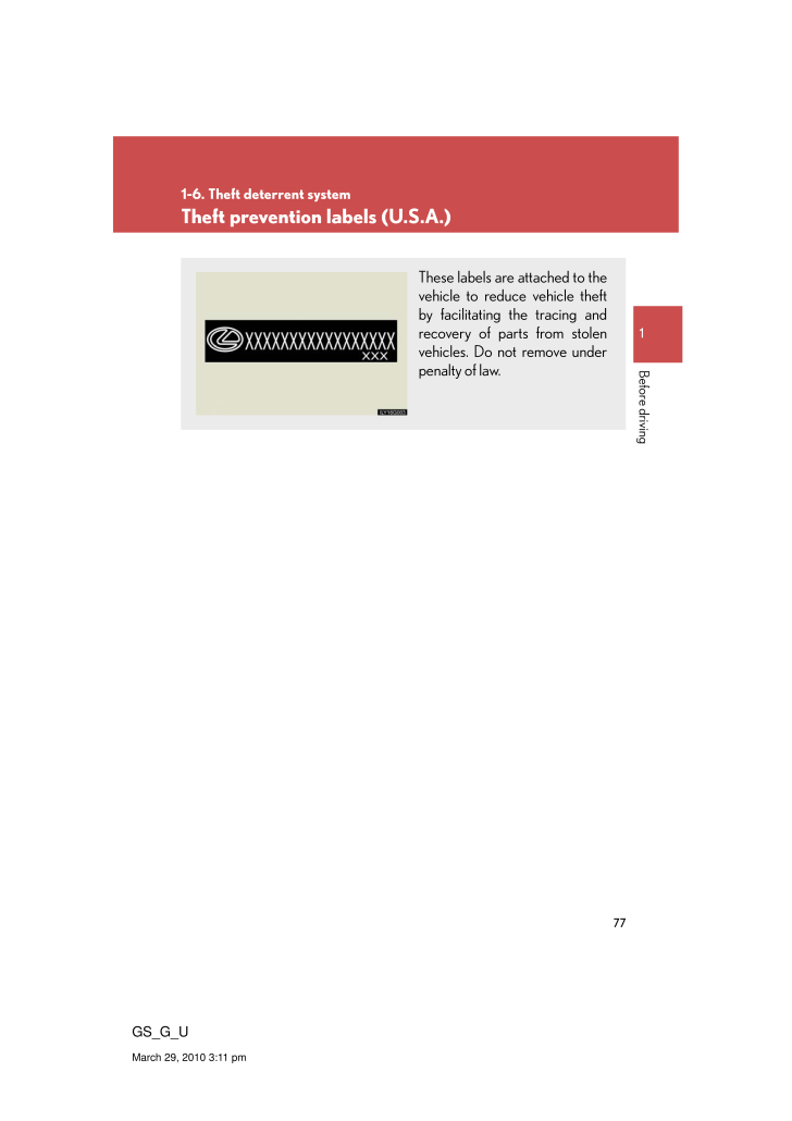 7711-6. Theft deterrent systemBefore drivingGS_G_UMarch 29, 2010 3:11 pmTheft prevention labels (U.S.A.)These labels are attached to the vehicle to reduce vehicle theft by facilitating the tracing and recovery of parts from stolen vehicles. Do not remove under penalty of law.