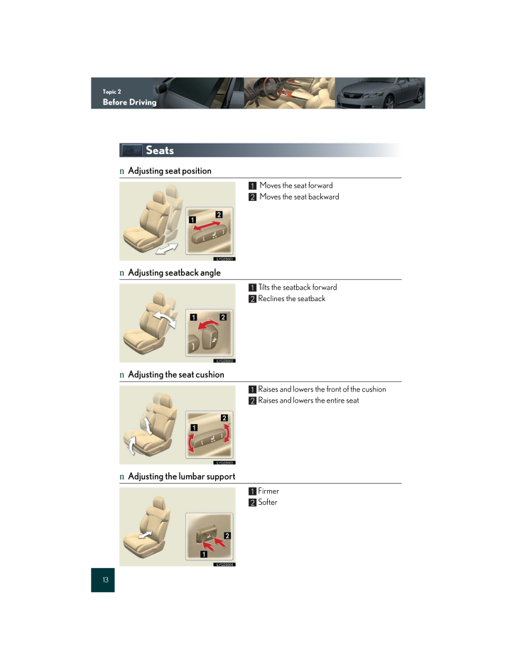 Topic 2Before Driving13Quick_GS_G_UAugust 19, 2008 3:41 pmSeatsnAdjusting seat position Moves the seat forward Moves the seat backwardnAdjusting seatback angleTilts the seatback forwardReclines the seatbacknAdjusting the seat cushionRaises and lowers the front of the cushionRaises and lowers the entire seatnAdjusting the lumbar supportFirmerSofter12121212