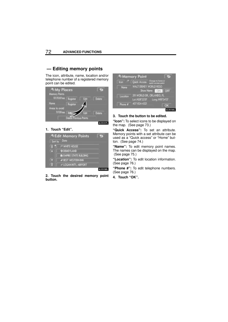 72ADVANCED FUNCTIONSThe icon, attribute, name, location and/ortelephone number of a registered memorypoint can be edited.1. Touch "Edit".2. Touch the desired memory pointbutton.3. Touch the button to be edited."Icon": To select icons to be displayed onthe map. (See page 73.)"Quick Access": To set an attribute.Memory points with a set attribute can beused as a "Quick access" or "Home" but-ton. (See page 74.)"Name": To edit memory point names.The names can be displayed on the map. (See page 75.)"Location": To edit location information.(See page 76.)"Phone #": To edit telephone numbers.(See page 76.)4. Touch "OK".- Editing memory points