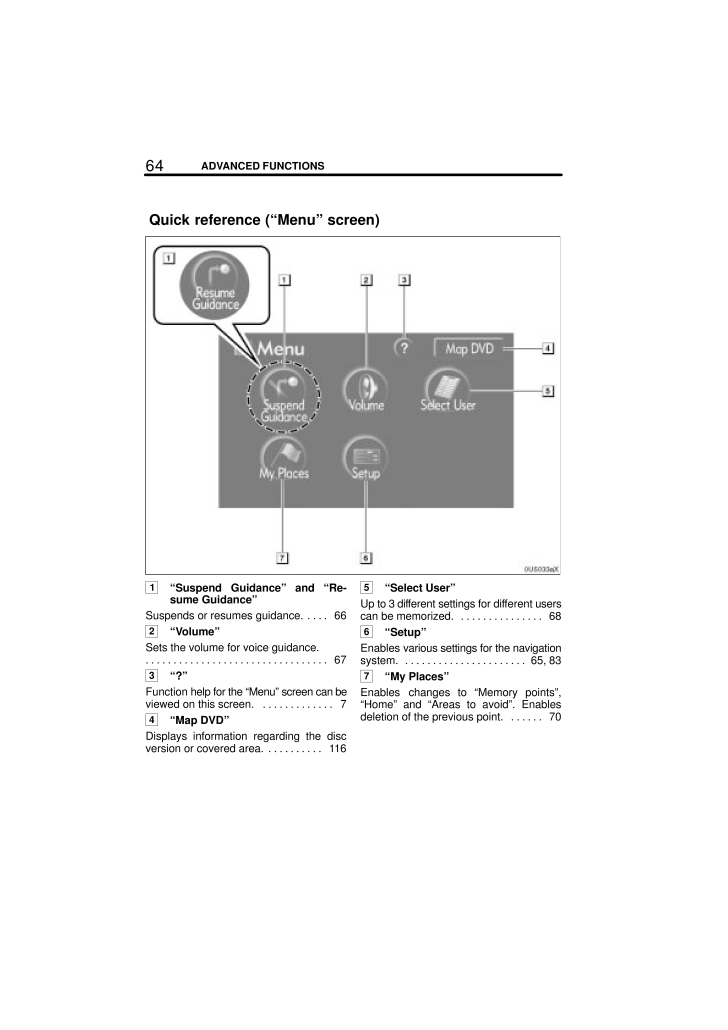 64ADVANCED FUNCTIONS1"Suspend Guidance" and "Re-sume Guidance"Suspends or resumes guidance. 66 . . . . 2"Volume"Sets the volume for voice guidance.67 . . . . . . . . . . . . . . . . . . . . . . . . . . . . . . . . . 3"?"Function help for the "Menu" screen can beviewed on this screen. 7. . . . . . . . . . . . . 4"Map DVD"Displays information regarding the discversion or covered area. 116. . . . . . . . . . 5"Select User"Up to 3 different settings for dif ferent userscan be memorized. 68. . . . . . . . . . . . . . . 6"Setup"Enables various settings for the navigationsystem. 65, 83 . . . . . . . . . . . . . . . . . . . . . . 7"My Places"Enables changes to "Memory points","Home" and "Areas to avoid". Enablesdeletion of the previous point. 70 . . . . . . Quick reference ("Menu" screen)