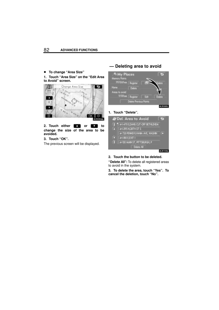 82ADVANCED FUNCTIONS To change "Area Size"1. Touch "Area Size" on the "Edit Areato Avoid" screen.2. Touch either or tochange the size of the area to beavoided.3. Touch "OK".The previous screen will be displayed.1. Touch "Delete".2. Touch the button to be deleted."Delete All": To delete all registered areasto avoid in the system.3. To delete the area, touch "Yes". Tocancel the deletion, touch "No".- Deleting area to avoid