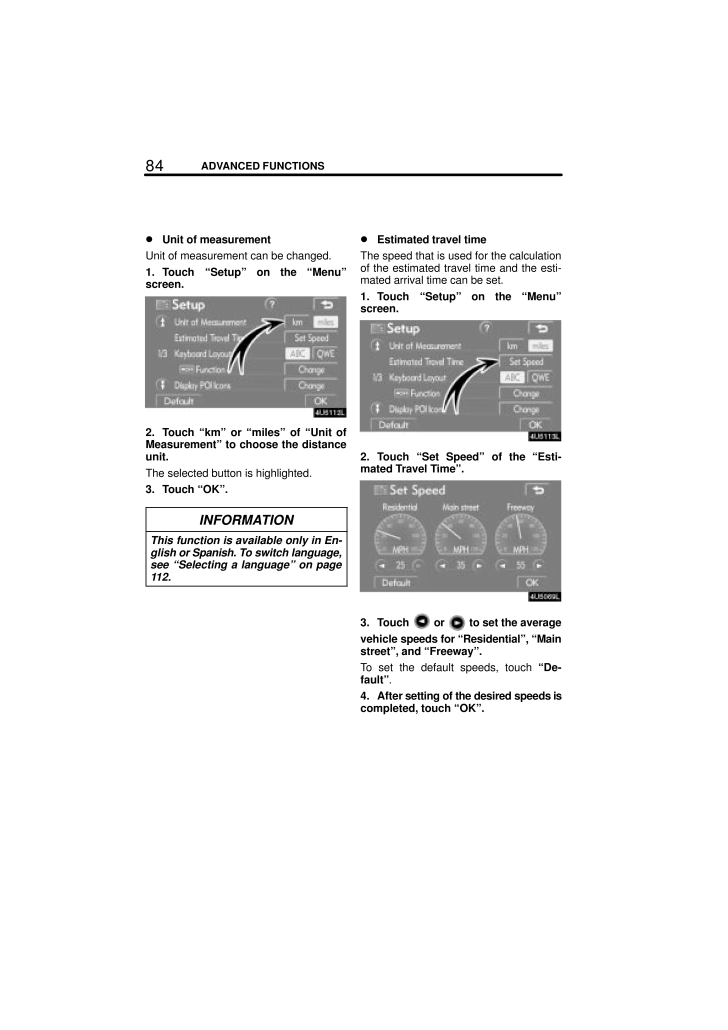84ADVANCED FUNCTIONS Unit of measurementUnit of measurement can be changed.1. Touch "Setup" on the "Menu"screen.2. Touch "km" or "miles" of "Unit ofMeasurement" to choose the distanceunit.The selected button is highlighted.3. Touch "OK".INFORMATIONThis function is available only in En-glish or Spanish. To switch language,see "Selecting a language" on page112. Estimated travel timeThe speed that is used for the calculationof the estimated travel time and the esti-mated arrival time can be set.1. Touch "Setup" on the "Menu"screen.2. Touch "Set Speed" of the "Esti-mated Travel Time".3. Touch or to set the averagevehicle speeds for "Residential", "Mainstreet", and "Freeway".To set the default speeds, touch "De-fault".4. After setting of the desired speeds iscompleted, touch "OK".
