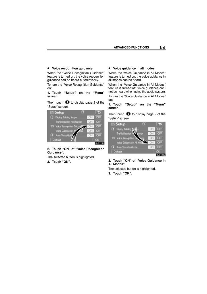 89ADVANCED FUNCTIONS Voice recognition guidanceWhen the "Voice Recognition Guidance"feature is turned on, the voice recognitionguidance can be heard automatically.To turn the "Voice Recognition Guidance"on:1. Touch "Setup" on the "Menu"screen.Then touch to display page 2 of the"Setup" screen.2. Touch "ON" of "Voice RecognitionGuidance".The selected button is highlighted.3. Touch "OK". Voice guidance in all modesWhen the "Voice Guidance in All Modes"feature is turned on, the voice guidance inall modes can be heard.When the "Voice Guidance in All Modes"feature is turned off, voice guidance can-not be heard when using the audio system.To turn the "Voice Guidance in All Modes"on:1. Touch "Setup" on the "Menu"screen.Then touch to display page 2 of the"Setup" screen.2. Touch "ON" of "Voice Guidance inAll Modes".The selected button is highlighted.3. Touch "OK".