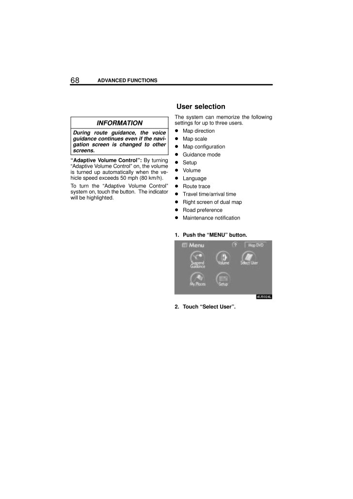 68ADVANCED FUNCTIONSINFORMATIONDuring route guidance, the voiceguidance continues even if the navi-gation screen is changed to otherscreens."Adaptive Volume Control": By turning"Adaptive Volume Control" on, the volumeis turned up automatically when the ve-hicle speed exceeds 50 mph (80 km/h).To turn the "Adaptive Volume Control"system on, touch the button. The indicatorwill be highlighted.The system can memorize the followingsettings for up to three users. Map direction Map scale Map configuration Guidance mode Setup Volume Language Route trace Travel time/arrival time Right screen of dual map Road preference Maintenance notification1. Push the "MENU" button.2. Touch "Select User".User selection