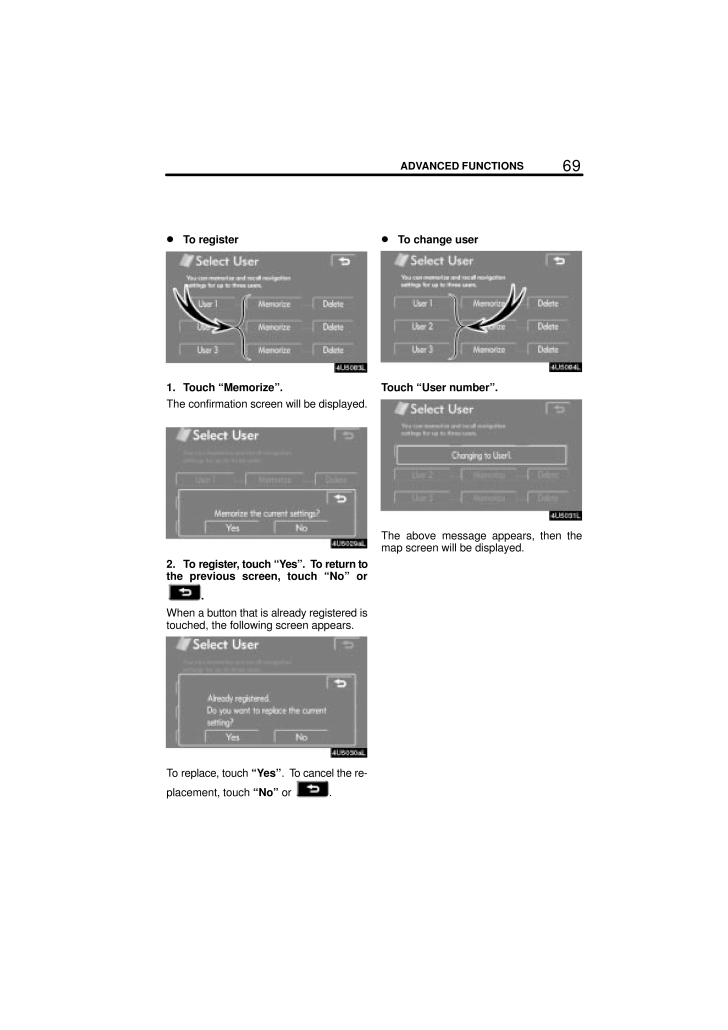 69ADVANCED FUNCTIONS To register1. Touch "Memorize".The confirmation screen will be displayed.2. To register, touch "Y es". To return tothe previous screen, touch "No" or.When a button that is already registered istouched, the following screen appears.To replace, touch "Yes". To cancel the re-placement, touch "No" or . To change userTouch "User number".The above message appears, then themap screen will be displayed.