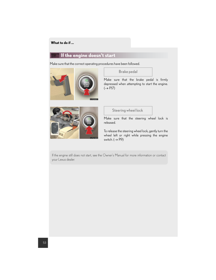 What to do if ...53If the engine doesn't startMake sure that the correct operating procedures have been followed.Make sure that the brake pedal is firmly depressed when attempting to start the engine. (→ P.17 )uMake sure that the steering wheel lock is released.To release the steering wheel lock, gently turn the wheel left or right while pressing the engine switch. (→ P.9 )ILYQ3A001Brake pedalILYQ1A002Steering wheel lockIf the engine still does not start, see the Owner's Manual for more information or contact your Lexus dealer.