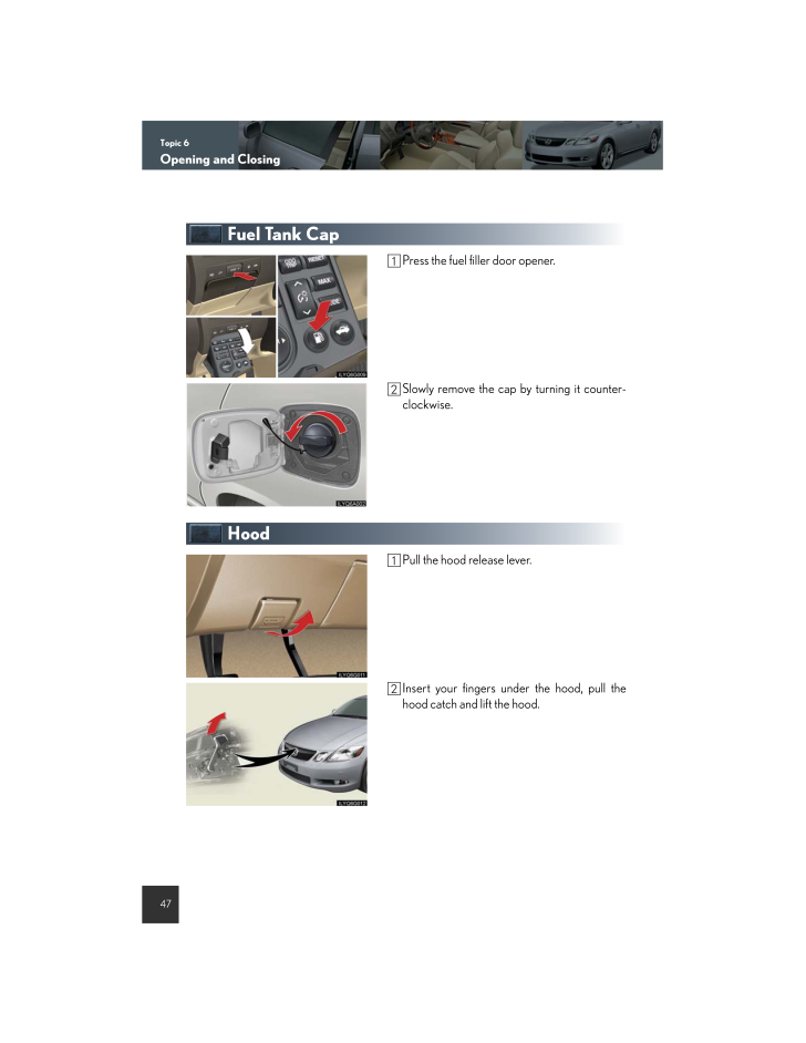 Topic 6Opening and Closing47Fuel Tank CapPress the fuel filler door opener.Slowly remove the cap by turning it counter -clockwise.HoodPull the hood release lever.Insert your fingers under the hood, pull the hood catch and lift the hood.