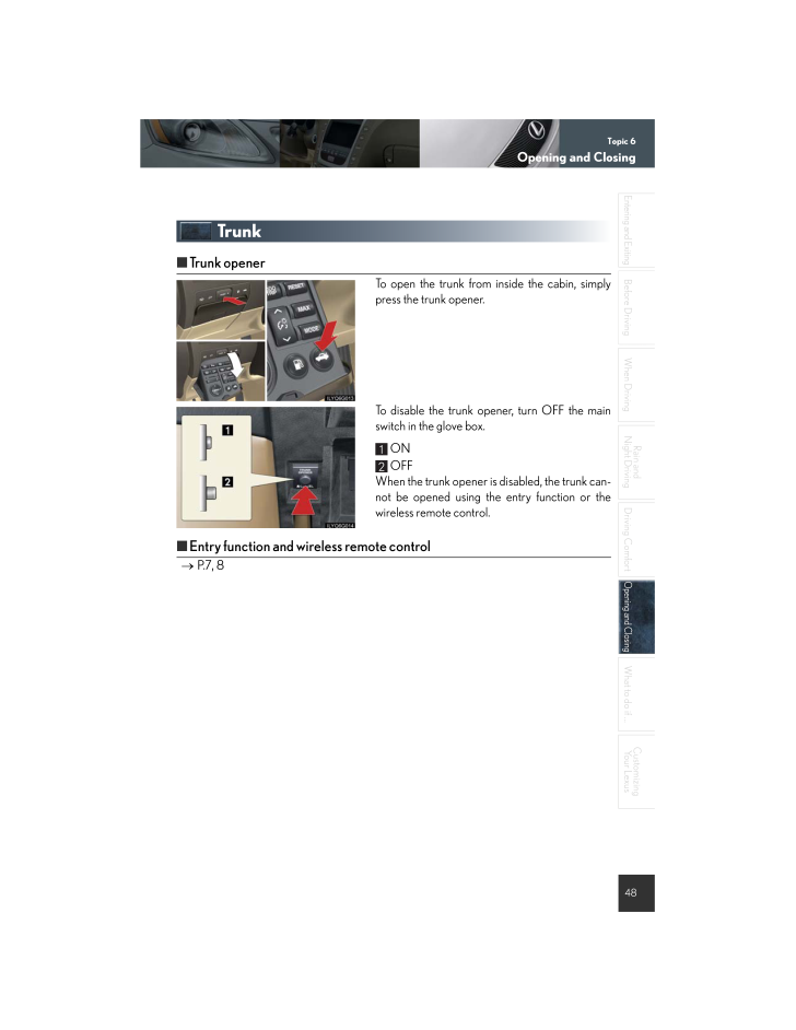 Topic 6Opening and Closing48Entering and ExitingBefore DrivingWhen DrivingRain and Night DrivingDriving ComfortOpening and ClosingWhat to do if ...CustomizingYour LexusTrunknTrunk openerTo open the trunk from inside the cabin, simply press the trunk opener.To disable the trunk opener, turn OFF the main switch in the glove box.ONOFFWhen the trunk opener is disabled, the trunk can -not be opened using the entry function or the wireless remote control.nEntry function and wireless remote control → P.7, 812