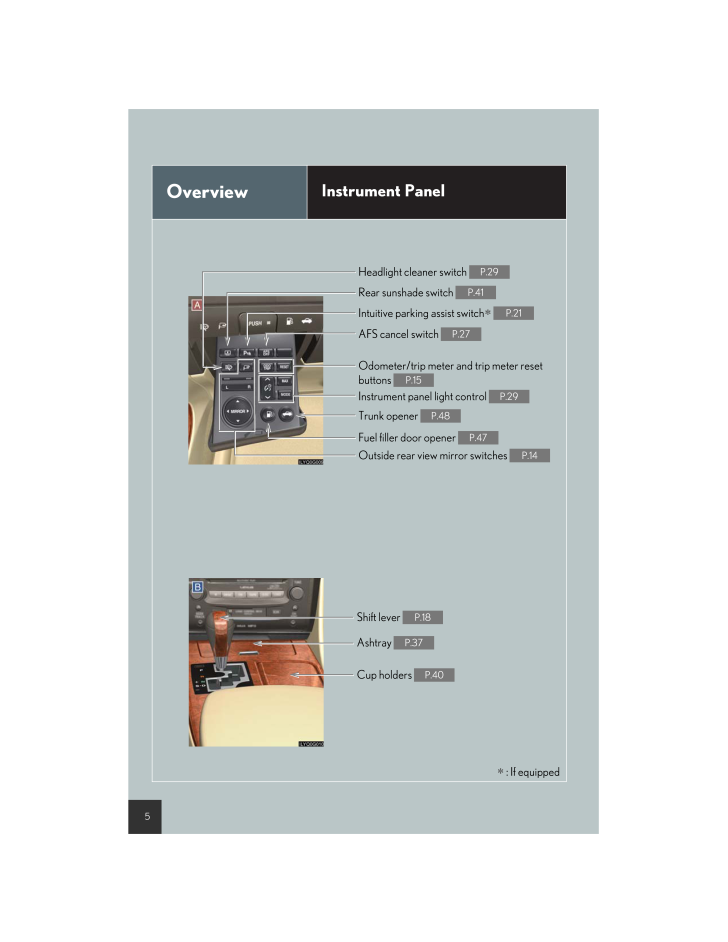 5OverviewInstrument Panel∗ : If equippedIntuitive parking assist switch∗ P.21Rear sunshade switch P.41Instrument panel light control P.29Trunk opener P.48Odometer/trip meter and trip meter reset buttons P.15Cup holders P.40Shift lever P.18Headlight cleaner switch P.29AFS cancel switch P.27Fuel filler door opener P.47Outside rear view mirror switches P.14Ashtray P.37