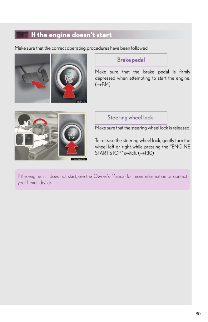 80If the engine doesn't startMake sure that the correct operating procedures have been followed.Make sure that the brake pedal is firmlydepressed when attempting to start the engine.(→P.14)Make sure that the steering wheel lock is released.To release the steering wheel lock, gently turn thewheel left or right while pressing the "ENGINESTART STOP" switch. (→P.10)Brake pedalSteering wheel lockIf the engine still does not st art, see the Owner's Manual fo r more information or contactyour Lexus dealer.