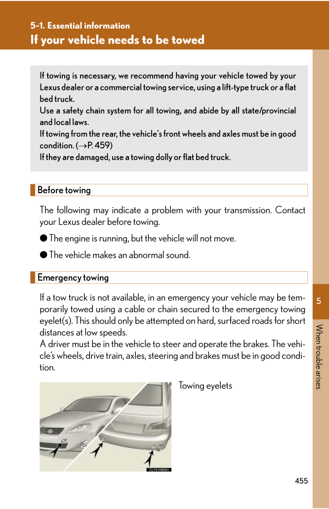 5When trouble arises4555-1. Essential informationIf your vehicle needs to be towedBefore towingThe following may indicate a problem with your transmission. Contactyour Lexus dealer before towing.●The engine is running, but the vehicle will not move.●The vehicle makes an abnormal sound.Emergency towingIf a tow truck is not available, in an emergency your vehicle may be tem-porarily towed using a cable or chain secured to the emergency towingeyelet(s). This should only be attempted on hard, surfaced roads for shortdistances at low speeds.A driver must be in the vehicle to s teer and operate the brakes. The vehi-cle's wheels, drive train, axles, steering and brakes must be in good condi-tion.Towing eyeletsIf towing is necessary, we recommend having your vehicle towed by yourLexus dealer or a commercial towing se rvice, using a lift-type truck or a flatbed truck.Use a safety chain system for all towi ng, and abide by all state/provincialand local laws.If towing from the rear, the vehicle's front wheels and axles must be in goodcondition. (→P. 459)If they are damaged, use a to wing dolly or flat bed truck.