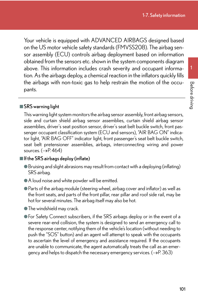 1011-7. Safety information1Before drivingYour vehicle is equipped with AD VANCED AIRBAGS designed basedon the US motor vehicle safety st andards (FMVSS208). The airbag sen-sor assembly (ECU) controls airbag deployment based on informationobtained from the sensors etc. show n in the system components diagramabove. This information includes cras h severity and occupant informa-tion. As the airbags deploy, a chemica l reaction in the inflators quickly fillsthe airbags with non-toxic gas to he lp restrain the motion of the occu-pants.■SRS warning lightThis warning light system monitors the airb ag sensor assembly, front airbag sensors,side and curtain shield airbag sensor assemblies, curtain shield airbag sensorassemblies, driver's seat position sensor, dr iver's seat belt buckle switch, front pas-senger occupant classification system (ECU and sensors), "AIR BAG ON" indica-tor light, "AIR BAG OFF" indicator light, fr ont passenger's seat belt buckle switch,seat belt pretensioner assemblies, airbags, interconnecting wiring and powersources. (→P. 464)■If the SRS airbags deploy (inflate)●Bruising and slight abrasions may result from contact with a deploying (inflating)SRS airbag.●A loud noise and white powder will be emitted.●Parts of the airbag module (steering wheel , airbag cover and inflator) as well asthe front seats, and parts of the front pill ar, rear pillar and roof side rail, may behot for several minutes. The airbag itself may also be hot.●The windshield may crack.●For Safety Connect subscriber s, if the SRS airbags deploy or in the event of asevere rear-end collision, the system is designed to send an emergency call tothe response center, notifying them of the vehicle's location (without needing topush the "SOS" button) and an agent will attempt to speak with the occupantsto ascertain the level of emergency and assistance required. If the occupantsare unable to communicate, the agent automatically treats the call as an emer-gency and helps to dispatch the necessary emergency services. ( →P. 363)