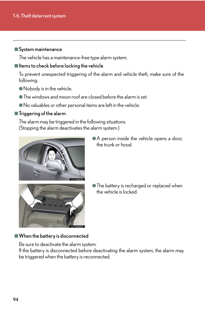 941-6. Theft deterrent system■System maintenanceThe vehicle has a maintenance-free type alarm system.■Items to check before locking the vehicleTo prevent unexpected triggering of the alarm and vehicle theft, make sure of thefollowing.●Nobody is in the vehicle.●The windows and moon roof are closed before the alarm is set.●No valuables or other personal items are left in the vehicle.■Triggering of the alarmThe alarm may be triggered in the following situations.(Stopping the alarm deactivates the alarm system.)■When the battery is disconnectedBe sure to deactivate the alarm system. If the battery is disconnected before de activating the alarm system, the alarm maybe triggered when the battery is reconnected.●A person inside the vehicle opens a door,the trunk or hood.●The battery is recharged or replaced whenthe vehicle is locked.