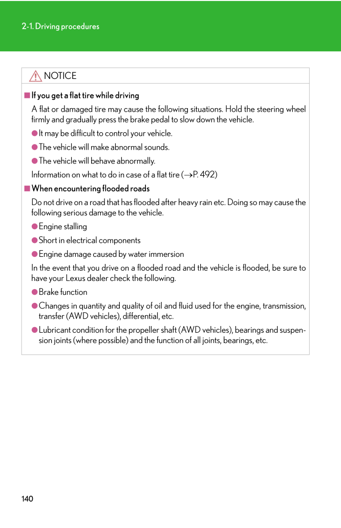 1402-1. Driving proceduresNOTICE■If you get a flat tire while driving A flat or damaged tire may cause the following situations. Hold the steering wheelfirmly and gradually press the brak e pedal to slow down the vehicle.●It may be difficult to control your vehicle.●The vehicle will make abnormal sounds.●The vehicle will behave abnormally.Information on what to do in case of a flat tire ( →P. 492)■When encountering flooded roadsDo not drive on a road that has flooded after heavy rain etc. Doing so may cause thefollowing serious damage to the vehicle.●Engine stalling●Short in electrical components●Engine damage caused by water immersionIn the event that you drive on a flooded road and the vehicle is flooded, be sure tohave your Lexus dealer check the following.●Brake function●Changes in quantity and quality of oil an d fluid used for the engine, transmission,transfer (AWD vehicles), differential, etc.●Lubricant condition for the propeller shaft (AWD vehicles), bearings and suspen-sion joints (where possible) and the function of all joints, bearings, etc.