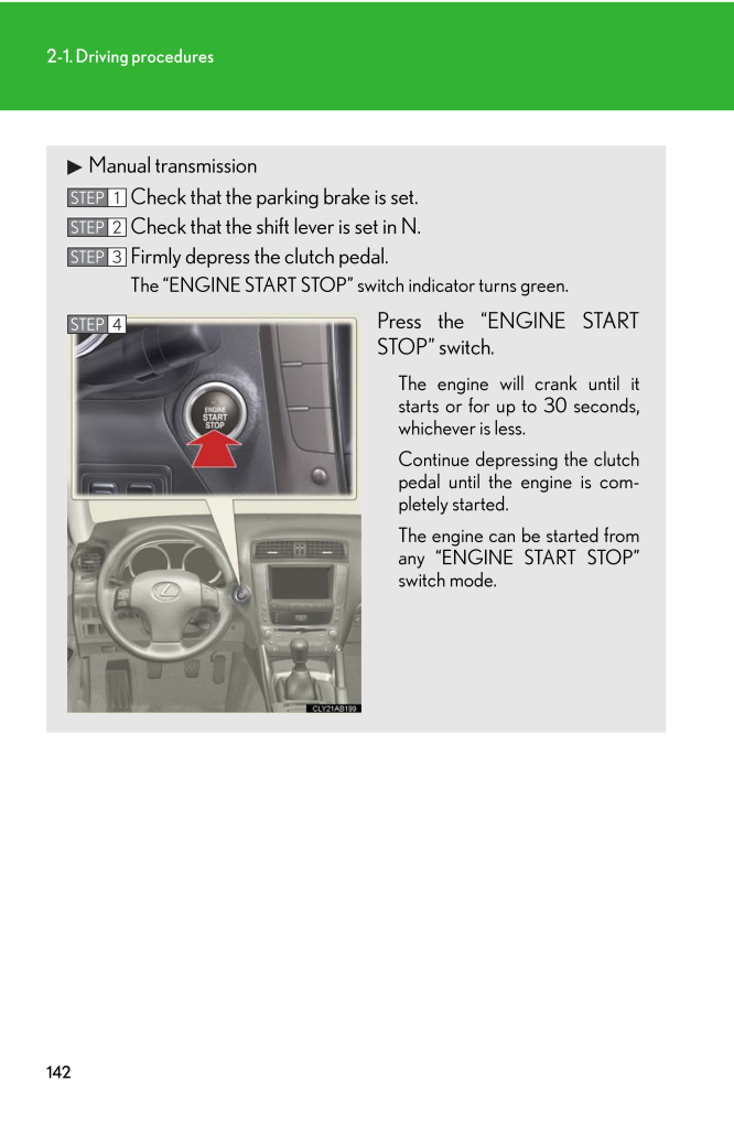 1422-1. Driving proceduresManual transmissionCheck that the parking brake is set.Check that the shift lever is set in N.Firmly depress the clutch pedal.The "ENGINE START STOP" switch indicator turns green.Press the "ENGINE STARTSTOP" switch.The engine will crank until itstarts or for up to 30 seconds,whichever is less.Continue depressing the clutchpedal until the engine is com-pletely started.The engine can be started fromany "ENGINE START STOP"switch mode.STEP 1STEP 2STEP 3STEP 4